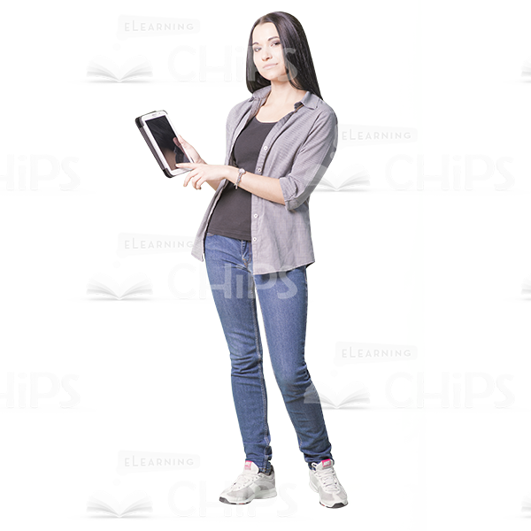- Appearance: European, young girl, woman, good-looking, nice, with tablet, using tablet, pointing at tablet, focused;