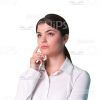 - Appearance: European, young woman, dark-haired, thoughtful, pensive, focused, hand on chin;