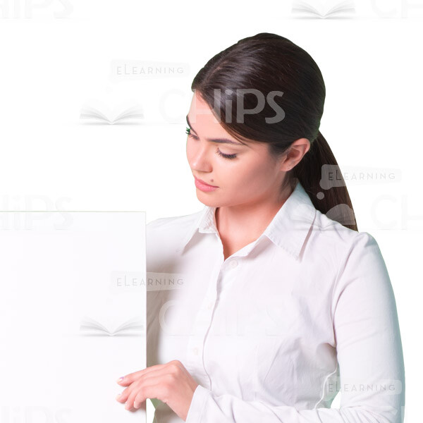 High quality cutout photo of presentable young woman wearing white blouse and black skirt. She’s standing straight and looking at white vertical poster. Due to classic clothing style could be used as a teacher, coach or course narrator. All photos are already clipped out so there’s no need to remove original background. Fell free to choose any characters’ photo and insert directly into your project. We have dozens of images of the same character with multiple emotions and poses.