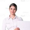 - Appearance: European, young woman, dark-haired, presentable, with board, with banner, with placard, with poster;