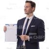 - Appearance: European, Caucasian, male, young man, guy, adult, businessman, fashion, exchange dealer, account manager, trader, lawyer, office employee, intelligent, educated, clever, person, elegant, dark hair, short hair, stylish haircut, worker, nice, chief, handsome, attractive, good-looking, smiling, positive, confident, optimistic, excited, concentrated, happy, focused, standing, gesturing, left profile, holding blue clipboard, looking at right side, keeping presentation, for content, hands up, page, white paper, placard in front of him, holding folder in right hand, making presentation, quarter-turned, pointing by pen to clipboard;
