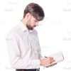 High-quality cutout image of young businessman standing sideways and writing something in his diary. Wearing business clothing. The photo shows the profile view. The great number of character’s poses were shoot from multiple angles covering lots of learning situation. It allows you to visualize your project in different ways creating stunning e-course or e-learning presentation.