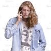 High-quality cutout image of a long haired man character talking the phone. He looks sad and pensive. A guy is fully involved in the phone conversation. Wearing casual clothes such as denim shirt, white T-shirt and black trousers. Can be used to illustrate a male character in elearning courses, marketing messages, advertisements, etc.