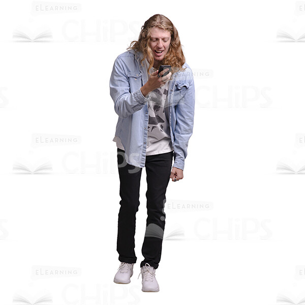 High-quality cutout picture of a long haired young man with mobile phone. He is holding it with a right hand while saying something. Looks like that he is slightly displeased. Wearing casual clothes such as denim shirt, white T-shirt and black trousers. Can be used to illustrate a male character in elearning courses, marketing messages, advertisements, etc.