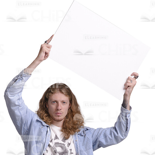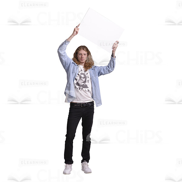 - Appearance: European, young man, male, guy, adult, blonde hair, long hair, serious, focused, emotionless, with board, with banner, with placard, with poster ;