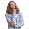 Thoughtful Young Man Standing Cutout Photo. High-quality cutout photo of an extraordinary young man standing half turned and holding his hand on chin. He looks thoughtful. He is wearing light-blue denim shirt and black jeans. His long hair, earring and fashion style show his commitment to youth subculture.T here are lots of photos of the same model shot from multiple angles with various postures and facial expressions. All cutout people images are presented with transparent backgrounds.