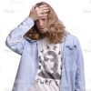Troubled Young Man Cutout Photo. High-quality cutout photo of an extraordinary young long haired man standing straight and holding his head. He looks disturbed. He is wearing light-blue denim shirt and black jeans. His long hair, earring and fashion style show his commitment to youth subculture.T here are lots of photos of the same model shot from multiple angles with various postures and facial expressions. All cutout people images are presented with transparent backgrounds.