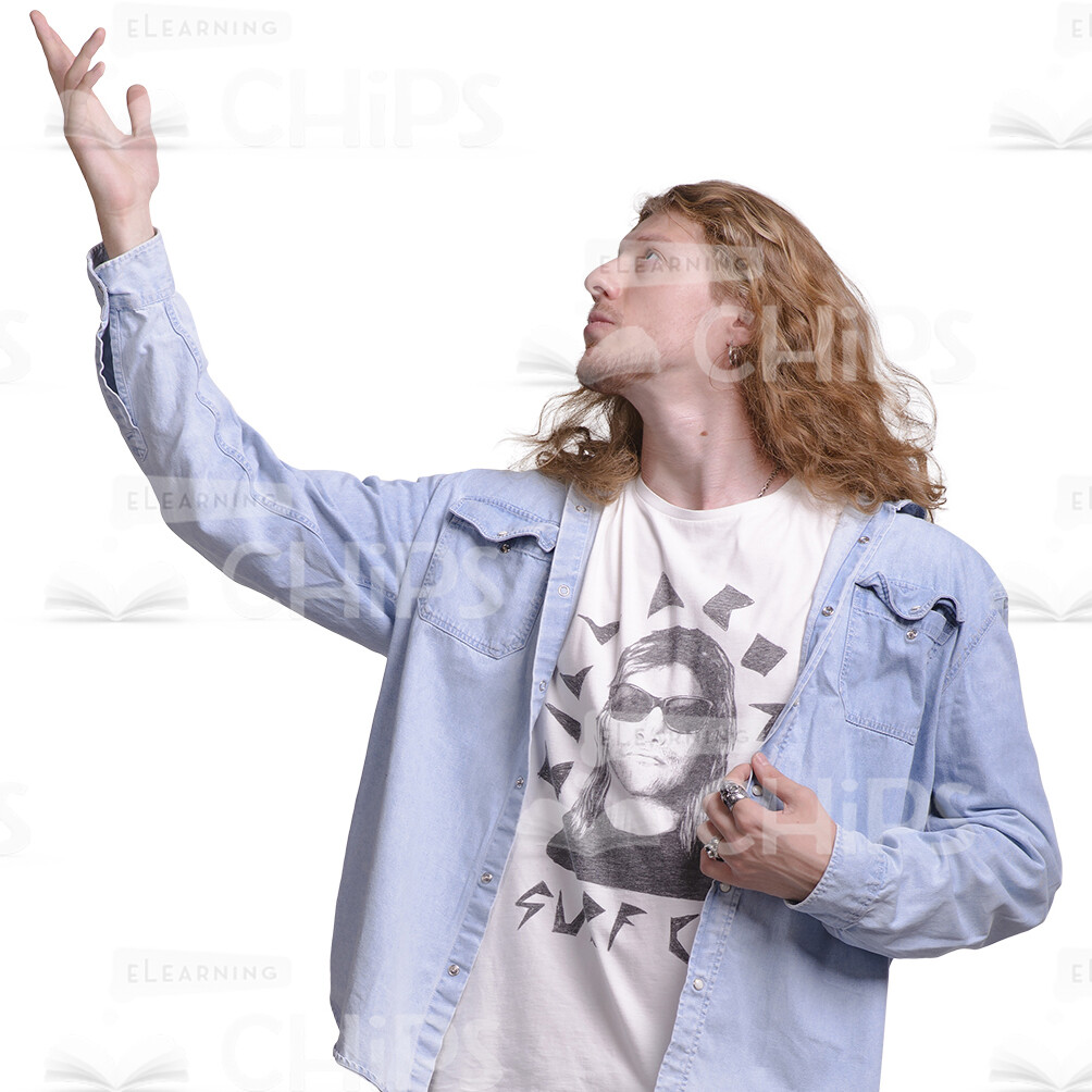 Long Haired Guy Pointing Up Cutout Photo. High-quality cutout photo of an extraordinary young man standing straight and putting his right hand up to show something. He turned his head to the side. The guy is wearing light-blue denim shirt and black jeans. His long hair, earring and fashion style show his commitment to youth subculture. There are lots of photos of the same model shot from multiple angles with various postures and facial expressions. All cutout people images are presented with transparent backgrounds.