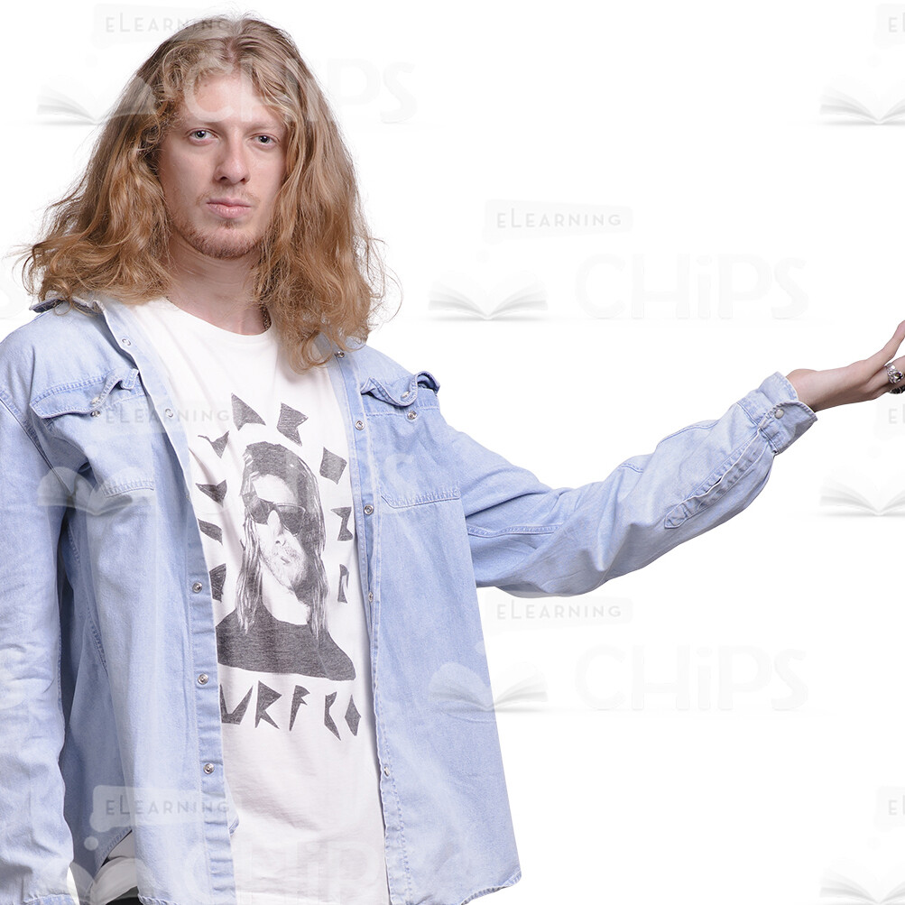 Long Haired Guy Showing Smth. Cutout Photo. High-quality cutout photo of an extraordinary young man standing half turned and presenting something with his left hand. His eyes are looking directly in camera. The guy is wearing light-blue denim shirt and black jeans. His long hair, earring and fashion style show his commitment to youth subculture. There are lots of photos of the same model shot from multiple angles with various postures and facial expressions. All cutout people images are presented with transparent backgrounds.