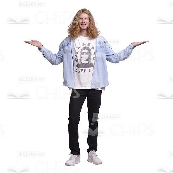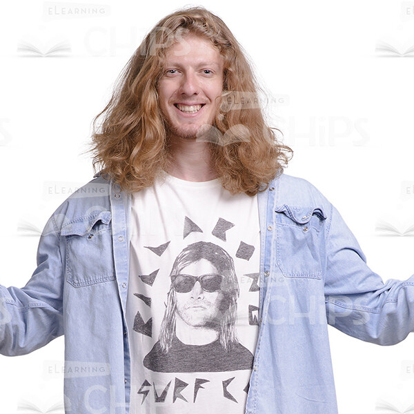 Smiling Guy With Widely Spaced Arms Cutout Photo. High-quality cutout image of a long haired man standing straight in a open pose with widely spaced arms, imitating scales position. His eyes are looking directly into the camera. Perfectly describe a person involved in educational process. Could be used in various presentations and e-learning modules. Wearing light-blue denim shirt and black jeans. His long hair, earring and fashion style show his commitment to youth subculture. The whole pack include a variety of poses and emotions. All photos were taken from multiple angles and available with transparent backgrounds. This will save you from routine work during e-course development.