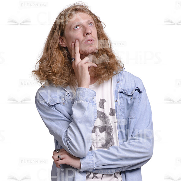 High-quality cutout image of a thoughtful young guy. He looks like thinking about something necessary. Wearing informal clothes such as denim shirt, black trousers and white printed T-shirt. His eyes are directed upwards.The cutout photo is available in few formats to fit the needs of every client. We’ve collected a large number of full-sized cutout people photos with different facial expressions, poses and gadgets. All of them are presented with the transparent backgrounds. All you need is to pick the right image and drop it into your elearning project.