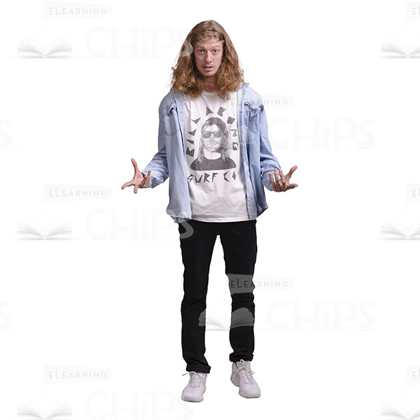 Long Haired Guy Throwing Hands Aside Cutout Photo. High-quality cutout image of a long haired man reacting emotionally to some kind of action. He is standing straight and is throwing his hands aside. The guy seems to be surprised. Could be used in various presentations and e-learning modules. Wearing light-blue denim shirt and black jeans. His long hair, earring and fashion style show his commitment to youth subculture. The whole pack include a variety of poses and emotions. All photos were taken from multiple angles and available with transparent backgrounds. This will save you from routine work during e-course development.