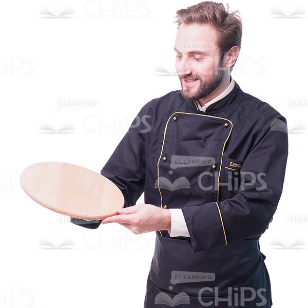 High-quality cutout picture of a handsome chef holding an empty wooden board with both hands. He looks smiling and focused. The photo can be used to illustrate an attractive young man dressed in chef’s uniform. It would be a perfect addition to any kind of web and print related projects. The presence of a transparent background greatly facilitates the process of working with the photo.