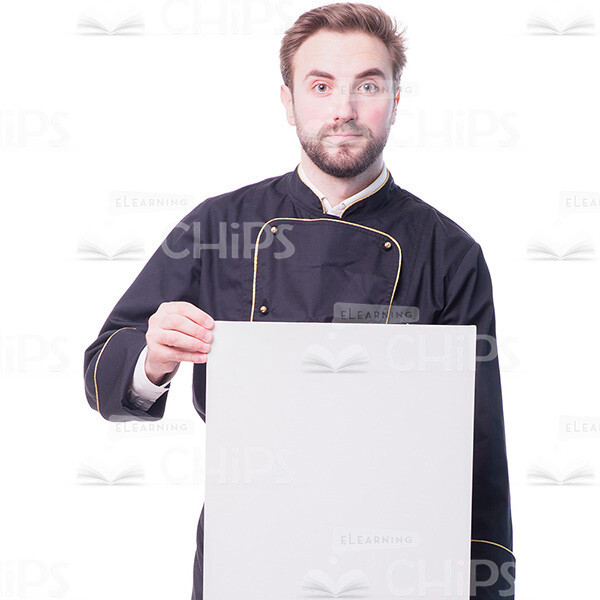 - Appearance: European, male, young man, adult, guy, brown hair, short haircut, bearded, chef, cook, catering employee, worker, staff, professional, service, culinary, attractive, nice, handsome, good-looking, with banner, holding board, with placard, focused, calm, serious, presenting;