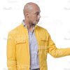 High-quality cutout image of a casually dressed young man standing in full growth. He is making a presenting pose while showing something with his left hand. Wears yellow jacket, modern shirt and blue jeans. This character can be used to illustrate a learner or casually dressed mentor during training process. Suitable for use in e-learning courses, advertisements, marketing projects, etc.