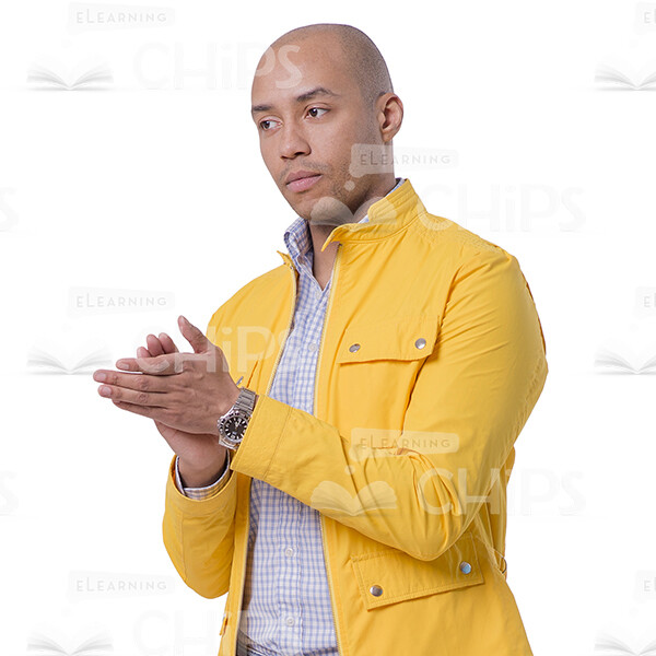 - Appearance: Latin American, young man, bald, shaved head, clapping hands, applaufind, focused, handsome, attractive, concentrated, half-turned;