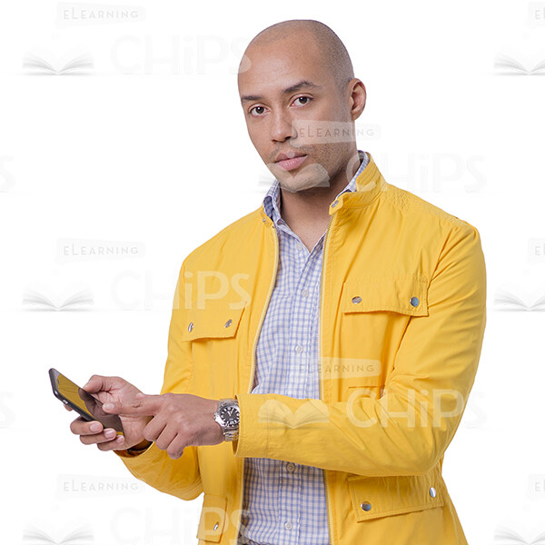 - Appearance: Latin American, young man, bald, shaved head, with mobile phone, holding the phone, pointing, serious, calm;