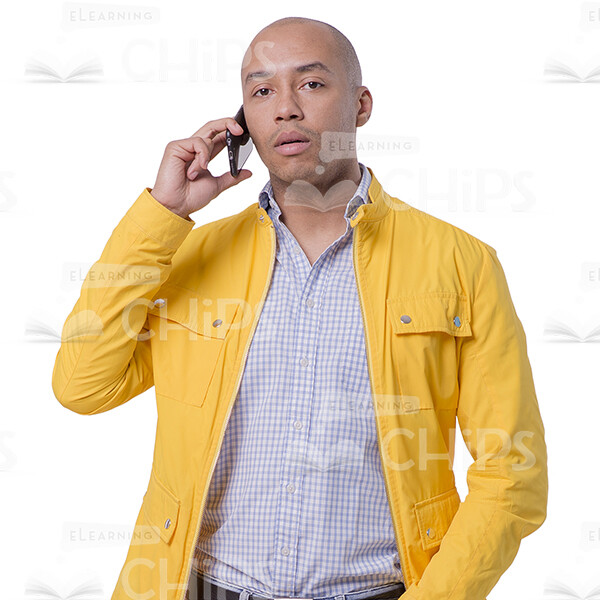 High-quality cutout picture of a thoughtful latino man character holding the phone conversation. His eyes are directed at the camera. Looks like he is thinking about something important. Dressed in casual clothes such as blue jeans, shirt and bright colored jacket. Would perfectly illustrate a modern student or a young business coach during the training process.