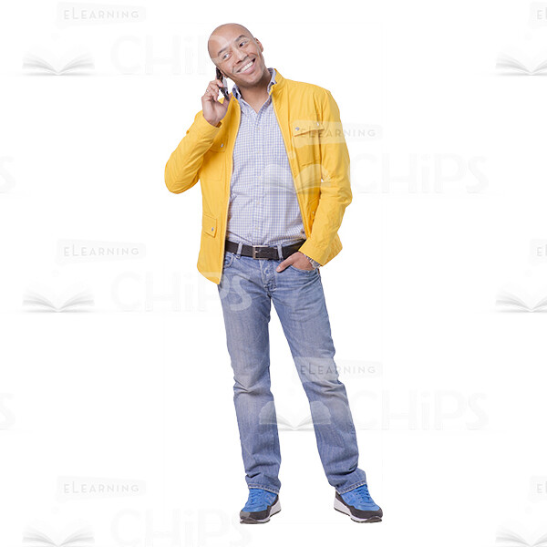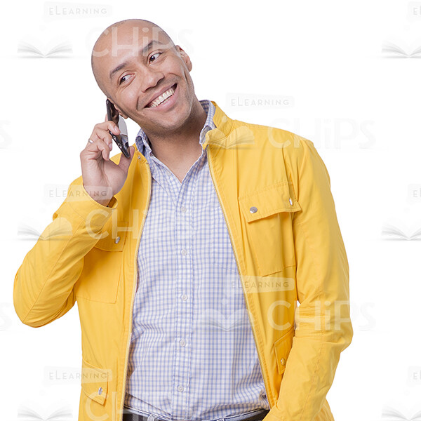 - Appearance: Latin American, young man, bald, shaved head, talking the phone, with mobile phone, happy, cheerful, smiling, laughing, nice, handsome, attractive, good-looking;