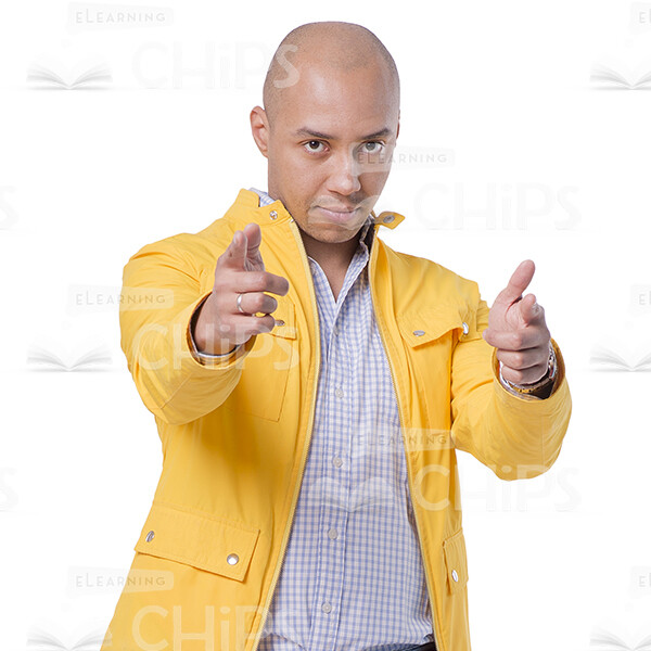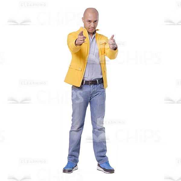 Full-length cutout picture of a young man who points with both hands at someone. His eyes are directed at the camera. He looks nice and confident. Dressed in casual clothes such as blue jeans, shirt and bright colored jacket. Would perfectly illustrate a modern student or a young business coach during the training process.