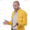 - Appearance: Latin American, young man, bald, shaved head, surprised, open-eyed, half-turned, discouraged, throwing hands up, spread hands;