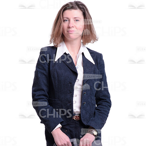 Full-sized cutout image of a polite businesswoman standing upright while holding a dark document case. She smiles slightly and looks directly at the camera. Dressed in a formal suit and a white blouse. The picture would be a great choice to illustrate a senior female business mentor, narrator or tutor. We’ve collected lots of Ella’s photos taken from multiple angles. Her poses, gestures and facial expressions look absolutely natural. Each picture is represented over the transparent background and is available in few various sizes. You’ll surely create an eye-catching e-learning course by using our attractive cutout characters.