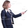 Full-length cutout image of a middle-aged woman standing in a half-turn. She is holding a presentation with a left hand. Dressed in a dark grey business suit and a white blouse. The photo would be a great addition to any kind of e-learning project. It would be useful to illustrate a female teacher, course narrator or business mentor. We’ve collected lots of Ella’s cutout photos with dozens of poses and facial expressions. Feel free to pick any picture(s) you need. Each picture is represented over in few sizes and over the transparent background.