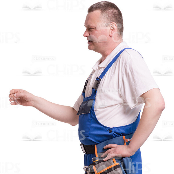 Full-length cutout image of middle-aged worker is standing sideways. He is gesticulating with his right hand, his left hand lies on his hip. Igor is explaining something to his interlocutor or he is arguing. The worker looks serious and self-content. The cut out photo would be an excellent addition to any type of web or print related project. The availability of the transparent background allows you just to drop the image over a slide, without any further processing. It’s available in few formats such as M, L and XL, to fit the needs of any customer. Feel free to look through our huge cutout people library and pick any photo(s) you need.
