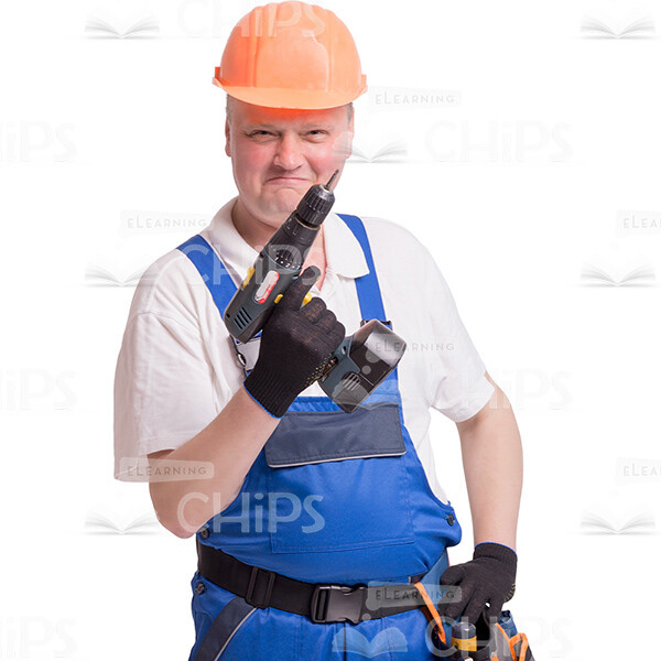 High-quality cutout photo of an excited mid-aged man holding a pucher with his right hand. Looks like that he is satisfied with the tool he holds. His eyes are directed at the camera. A man is dressed in builder uniform: a blue overall, white polo shirt, and orange hard hat. The cut out character photo would be a great addition to any kind of web-design project. It’s represented in the few different sizes to fit the needs of any customer. The transparent background allows you just to drop the image into the project, without any additional processing. Just choose the size you need and start to create an amazing visual story for your trainees.
