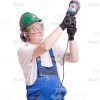 High-quality cutout picture of a middle-aged worker holding a grinding power tool with both raised up hands. He is standing in a quarter-turned pose. A man is dressed in safety workwear such as protective glasses, green hard hat and industrial headphones. The cut out character photo would be a great addition to any kind of web-design project. It’s represented in the few different sizes to fit the needs of any customer. The transparent background allows you just to drop the image into the project, without any additional processing. Just choose the size you need and start to create an amazing visual story for your trainees.