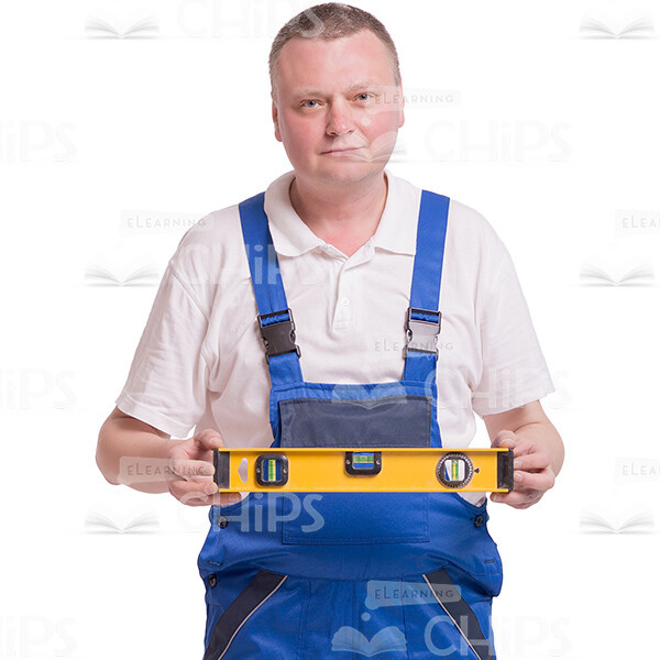 Full-length cutout image of middle-aged worker is standing upright with his feet shoulder-width apart. He is holding a level tube in his hands. Igor is looking at the camera. The worker looks calm and pleased. He is ready to start working with the instrument. This male cutout character’s photo would be a great choice to illustrate a construction professional in any kind of web-design project. It is available in few different sizes such as M, L and XL, to fit the needs of any client. Just look through our cutout people library and pick any image(s) you need to create an own fascinating e-course.