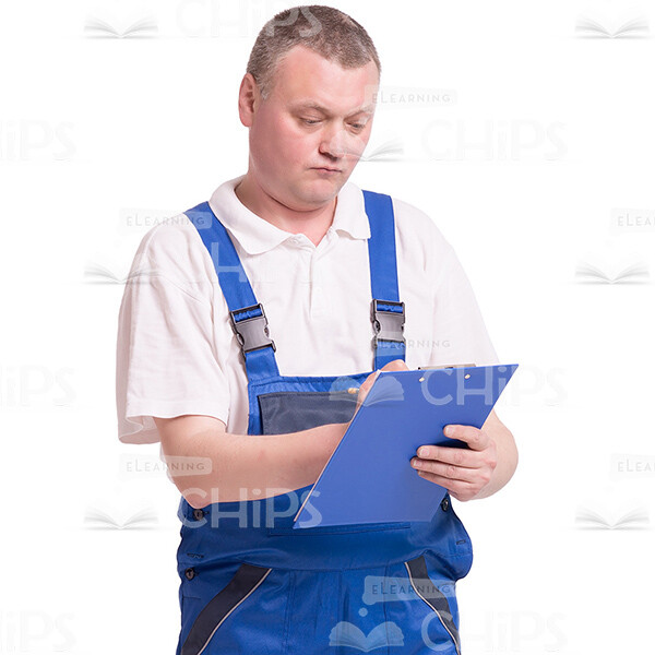 Full-resolution cutout photo of a serious delivery officer making notes. He is holding a clipboard with a left hand while writing with a right hand. His eyes are directed at the clipboard. A man is dressed in worker’s uniform such as blue overall and white polo shirt. We’ve collected lots of the same model’s photos with dozens of poses, gadgets and emotions, especially for e-learning course developers. They would be useful to illustrate a skilled industrial employee during the work. Each image is represented in few sizes and is available with the transparent background. Feel free to browse our huge cutout people library and pick any picture(s) you need to create an amazing visual story.