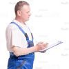 Full-resolution cutout photo of a half-turned middle-aged man holding a clipboard. He is listening to his interlocutor and going to make some notes. A man is dressed in worker’s uniform such as blue overall and white polo shirt. We’ve collected lots of the same model’s photos with dozens of poses, gadgets and emotions, especially for e-learning course developers. They would be useful to illustrate a skilled industrial employee during the work. Each image is represented in few sizes and is available with the transparent background. Feel free to browse our huge cutout people library and pick any picture(s) you need to create an amazing visual story.