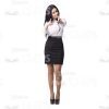 Full-length cutout photo of a nice woman character standing in full growth. She slightly titles her head while points with both hands at the camera. Wears business clothes such as black skirt and white blouse. This image would perfectly illustrate a mentor, tutor or young teacher during the learning process. Can be used in web-design projects.