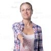 High-quality cutout image of a woman with a friendly face offering her hand to greet someone. Could be used in various presentations and e-learning modules. Her outer clothing is simple, but tasteful: bright plaid shirt and blue jeans. Would be perfect illustration for casually dressed middle-aged person.