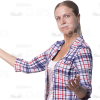 - Appearance: European, middle-aged woman, inviting, showing, pointing, presenting pose