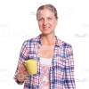 - Appearance: European, middle-aged woman, smiling, cheerful, with cup, holding cup