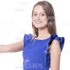 Full-length cutout image of a neat young girl wearing gorgeous casual blue dress. Would be perfect illustration of graceful young woman involved in hypothetical conversation. In this photo our girl is smiling, standing half-turned and greeting someone while looking at camera. Can be used in various presentation and e-learning modules.