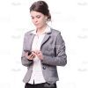 - Style: business wear, gray jacket, white blouse and dark pants;