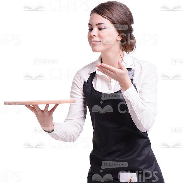 - Appearance: European, young woman, lady, girl, adult, dark-haired, waitress, cook, catering employee, worker, staff, professional, service, culinary, restaurant, waiter, handsome, nice, glad, cute, beautiful, pretty, good-looking, attractive, with wooden plate, holding round tray, gesturing, pointing, presenting, smiling, friendly, polite;