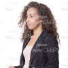 Full-length cutout image of curly good-looking girl. Mariana is half-turned listening actively.
