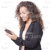 Full-length cutout image of curly good-looking girl. Mariana dealing with some business using her phone.