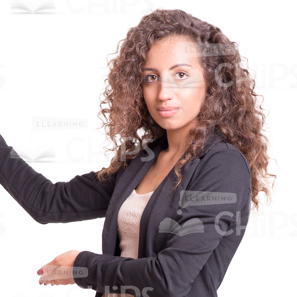 Curly young girl standing straight and presenting something. Her attractive stylish look will definitely charm everyone. Would perfectly illustrate the person prohibiting something. Could be perfect addition to e-learning courses of any kind. This friendly looking young lady will help you to present your project in a positive way. All photos are available in four variations and presented on a transparent background.