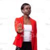 - Appearance: African, American, woman, young, adult, female, lady, businesswoman, person, long hair, fashion, beautiful, trader, exchange dealer, account manager, lawyer, office employee, nice, good-looking, intelligent, educated, clever, dark hair, stylish, collected hair, worker, attractive, calm, serious, confident, elegant, focused, concentrated, thoughtful, holding right hand up, stop gesture by right palm, looking at camera, spread fingers, focus in front of here, with stop sign right hand, refuse, gesticulating right arm No;