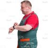 High-quality cutout image of a middle-aged man. He is a repairman. We have a full-length photo. He is standing with the profile view. His eyes are not directed at the camera. He has the arm watches on his left hand and he is pointing with his right hand finger at them. The man has the blonde hair with the short haircut. He is dressed in worker’s uniform, such as green overall and red T-shirt. We’ve collected lots of the same model’s photos with dozens of poses, gadgets and emotions, especially for e-learning course developers. They would be useful to illustrate a skilled industrial employee during the work. Each image is represented in few sizes and is available with the transparent background. Feel free to browse our huge cutout people library and pick any picture(s) you need to create an amazing visual story.