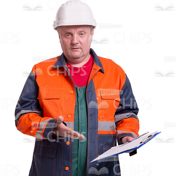 High-quality cutout image of a middle-aged man. He is a repairman. We have a full-length photo. He is standing with the full face. He is calm and holding in his left hand the notebook and pointing on it with the right hand. His eyes are directed at the camera. He is dressed in worker’s uniform, such as green overall with the jacket and red T-shirt. He has the white helmet. We’ve collected lots of the same model’s photos with dozens of poses, gadgets and emotions, especially for e-learning course developers. They would be useful to illustrate a skilled industrial employee during the work. Each image is represented in few sizes and is available with the transparent background. Feel free to browse our huge cutout people library and pick any picture(s) you need to create an amazing visual story.
