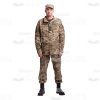 Full-length cutout photo of a handsome mid-aged man wearing the military uniform. He is standing full face, his eyes are directed at the camera. The man is looking seriously and he is calm and concentrated. The man is dressed in military uniform such as black boots, camouflage pants, jacket and patrol cap. The photo would be a great choice to illustrate an experienced professional military man in any kind of web-design project.