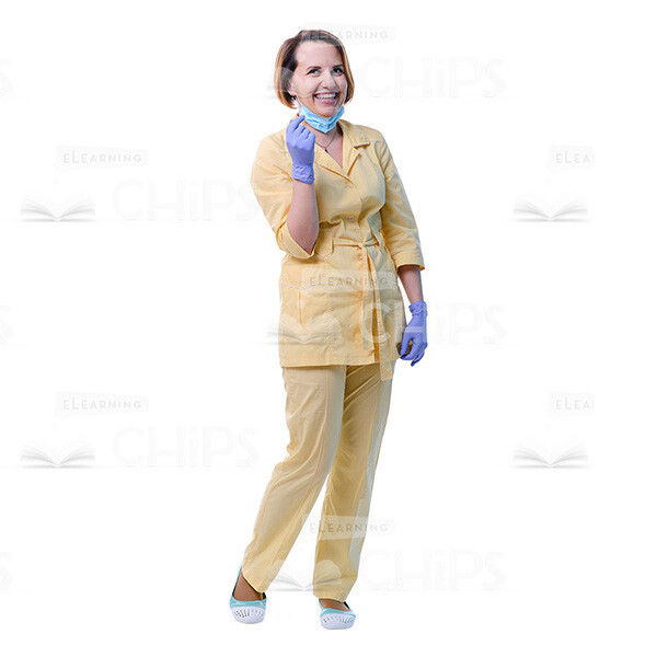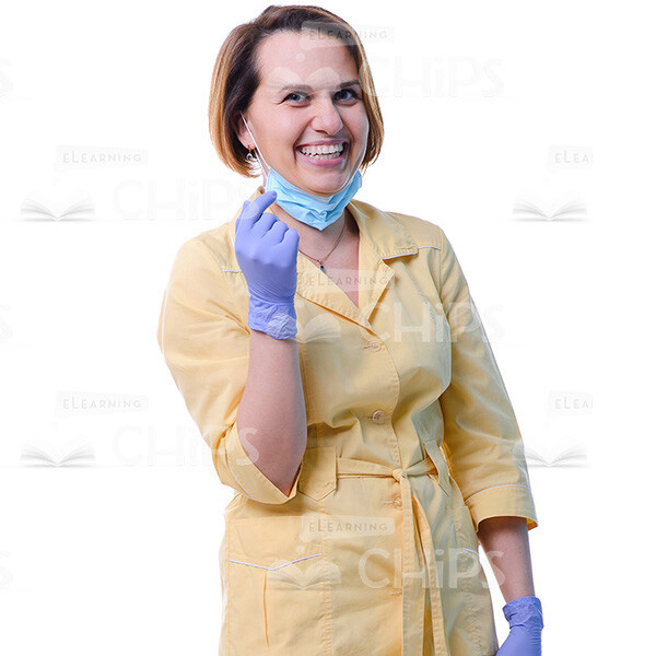 High-quality cutout image of an excited doctor gesturing with her right hand. She looks happy and smiling. Wearing medical uniform, protective gloves and mask. It would be an excellent addition to web or print related projects. Useful for elearning courses, promotions and presentations on the medical and pharmaceutical themes.