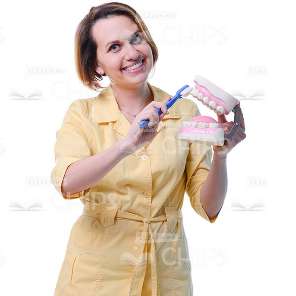 High-quality cutout picture of a happy dentist standing upright. She is holding a toothbrush and an anatomical jaw model. A doctor is showing how to brush the teeth correctly. It would be an excellent addition to web or print related projects. Useful for elearning courses, promotions and presentations on the medical and pharmaceutical themes.