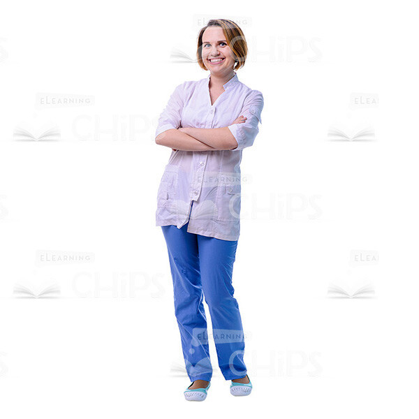 Full-sized cutout photo of an attractive young woman wearing medical uniform. She is standing upright with her arms crossed and looking at the camera. Could be used to illustrate the female health professional. We collect a variety of cut out people photos to provide an ability to the customers create an original visual story. You may use all of these photos in presentations, elearning courses or any other web-designed project. Each image is available in few different sizes to fit the needs of any client.
